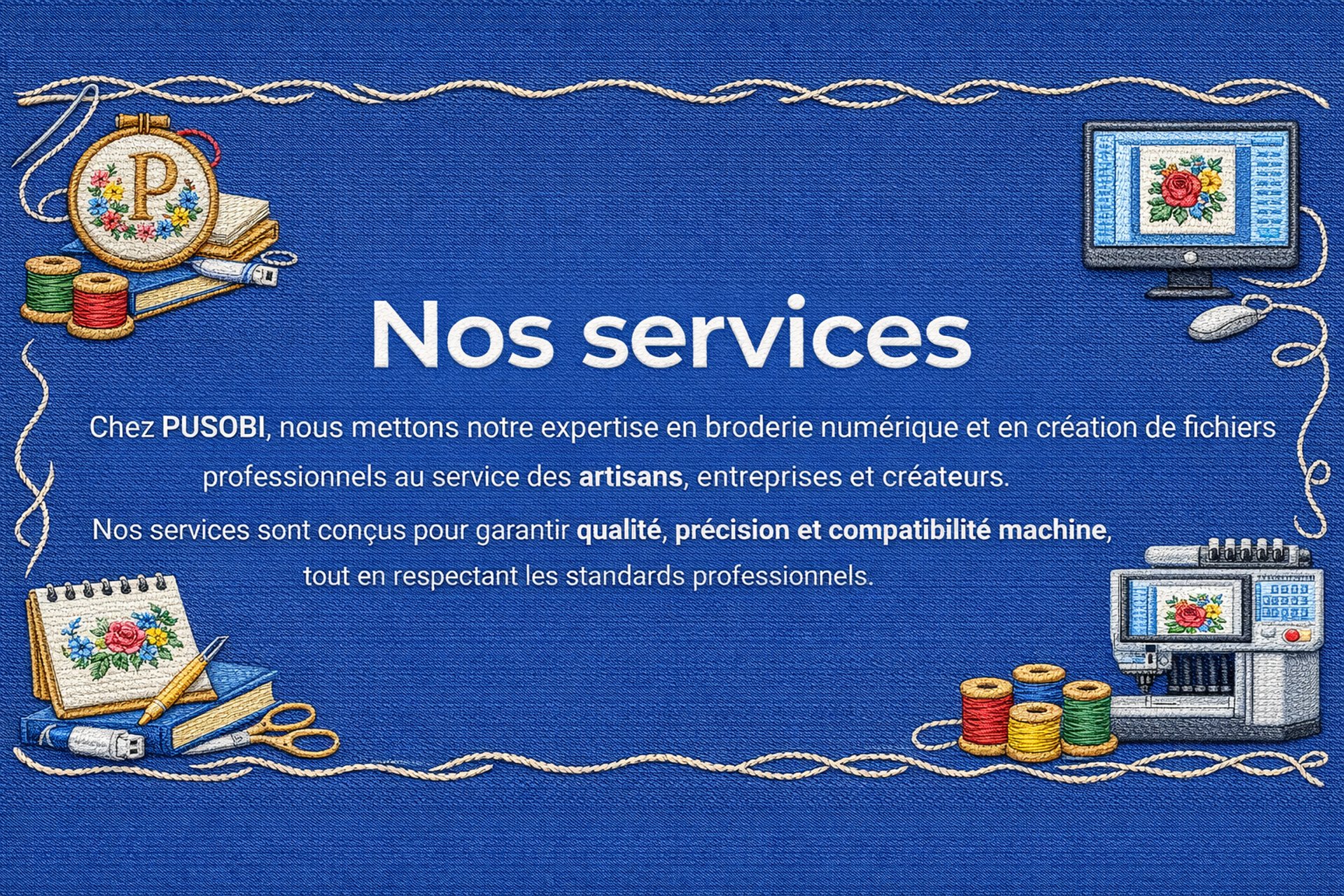 Dans une phase progressive, PUSOBI développe un service de broderie professionnelle sur machine, destiné aux clients souhaitant une réalisation complète.